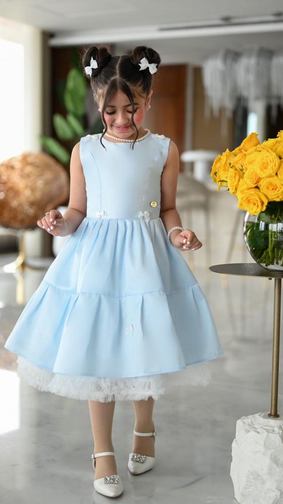 هذا الفستان المميز بلونه السماوي من قماش تفتة روسي مع لمسات فيونكات أوف وايت بالاضافة إلى حزام ربطة من الخلف ليضفي لمسة من الفخامة والجاذبية.