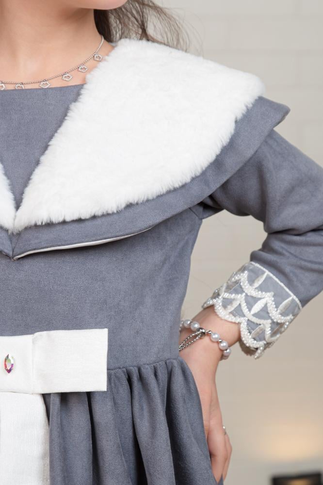 فستان شتوي بناتي فاخر من متجر أروشي، باللون الرمادي الداكن . يتميز بقماش شمواة ناعم يمنح الدفء والراحة في الأجواء الباردة. تصميمه كلاسيكي راقي بياقة فرو كبيرة وأكمام طويلة وأطراف من الدانتيل .