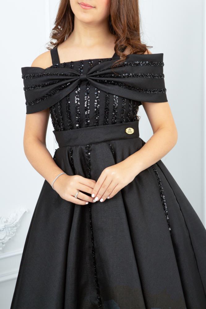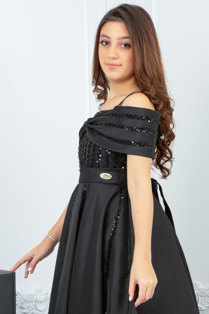 - الجزء العلوي: يتميز بكسرات طولية مزينة بتطريزات لامعة ناعمة، مع تصميم مميز للكتف يشبه العقدة الكبيرة الأنيقة التي تغلف الكتفين بشكل انسيابي ومبتكر، مع حمالات رفيعة تضيف ثباتًا وأناقة.