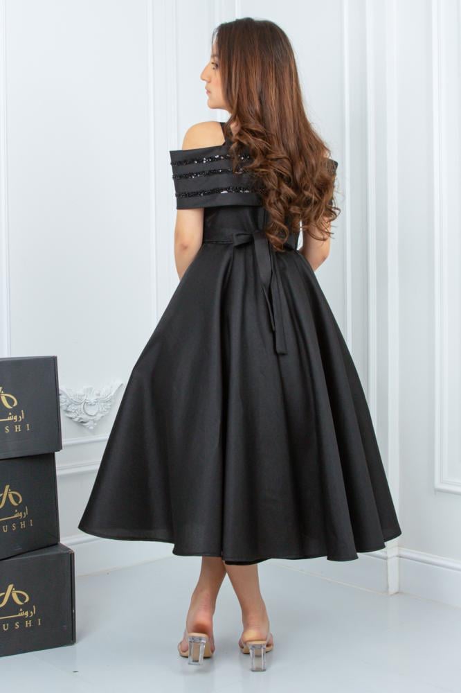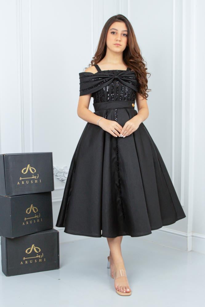 - القصّة: الفستان بستايل "A-line" متوسط الطول، يمنح الجسم توازنًا وأناقة، ويضفي لمسة من الرقي والجاذبية الناعمة.