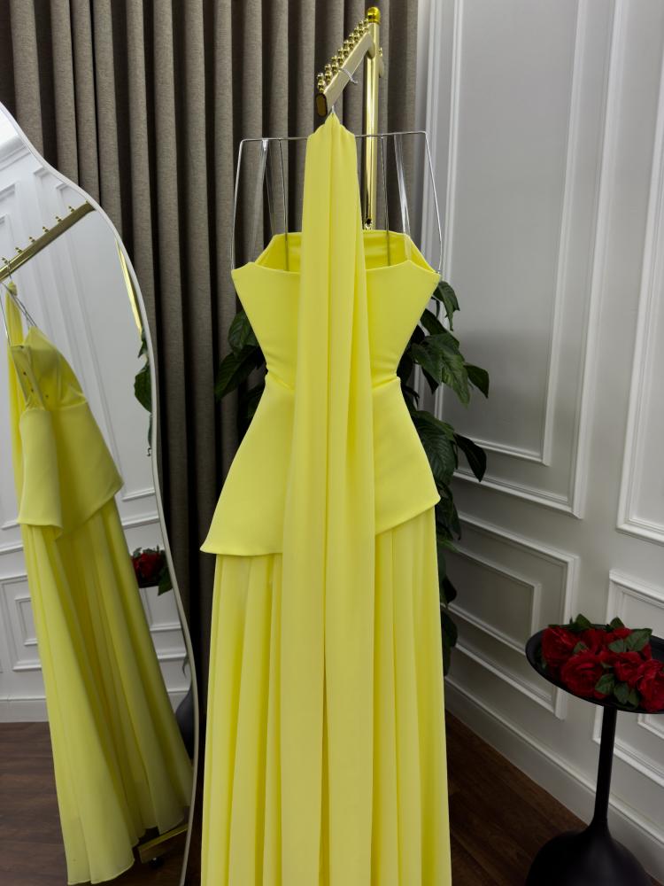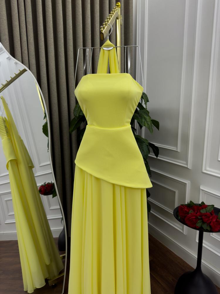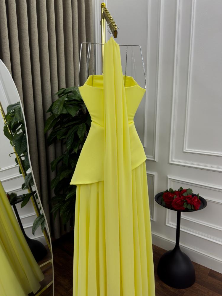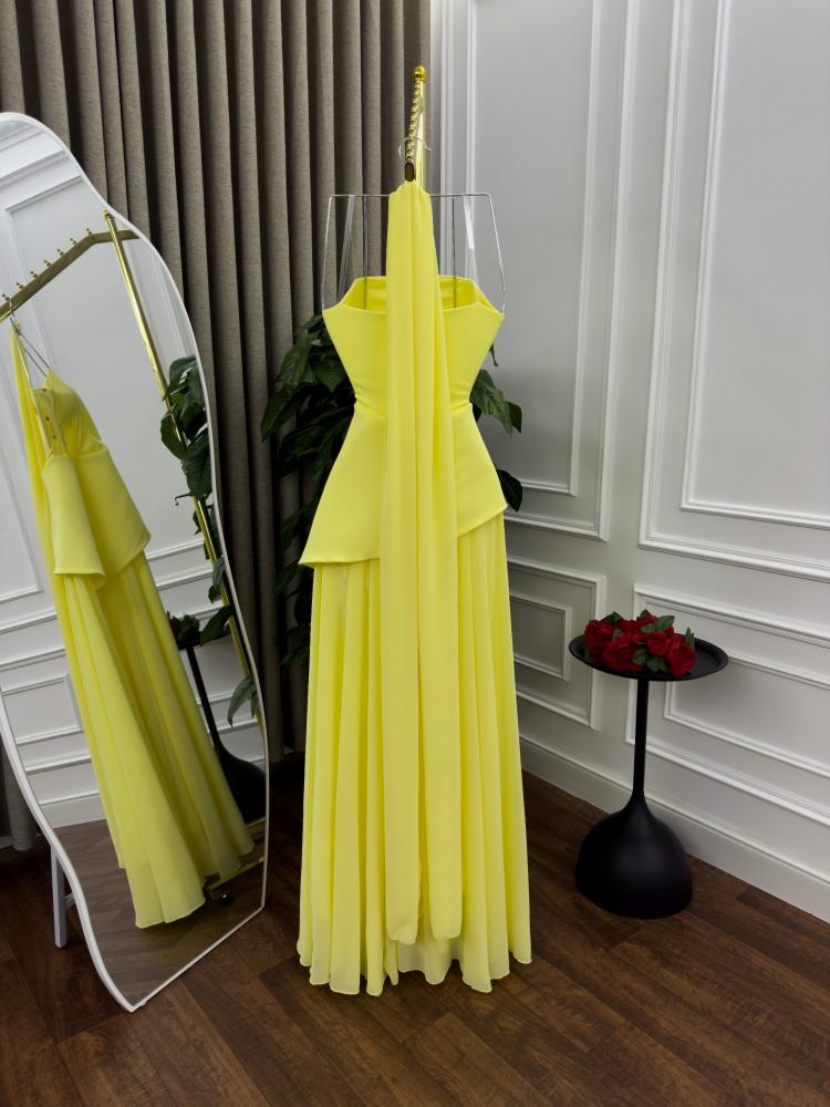 يتميز فستان السهرة بلونه الليموني الأنيق من خامة الشيفون والباربي بالاضافة الى كلوش تحت ليضفي المزيد من الأناقة