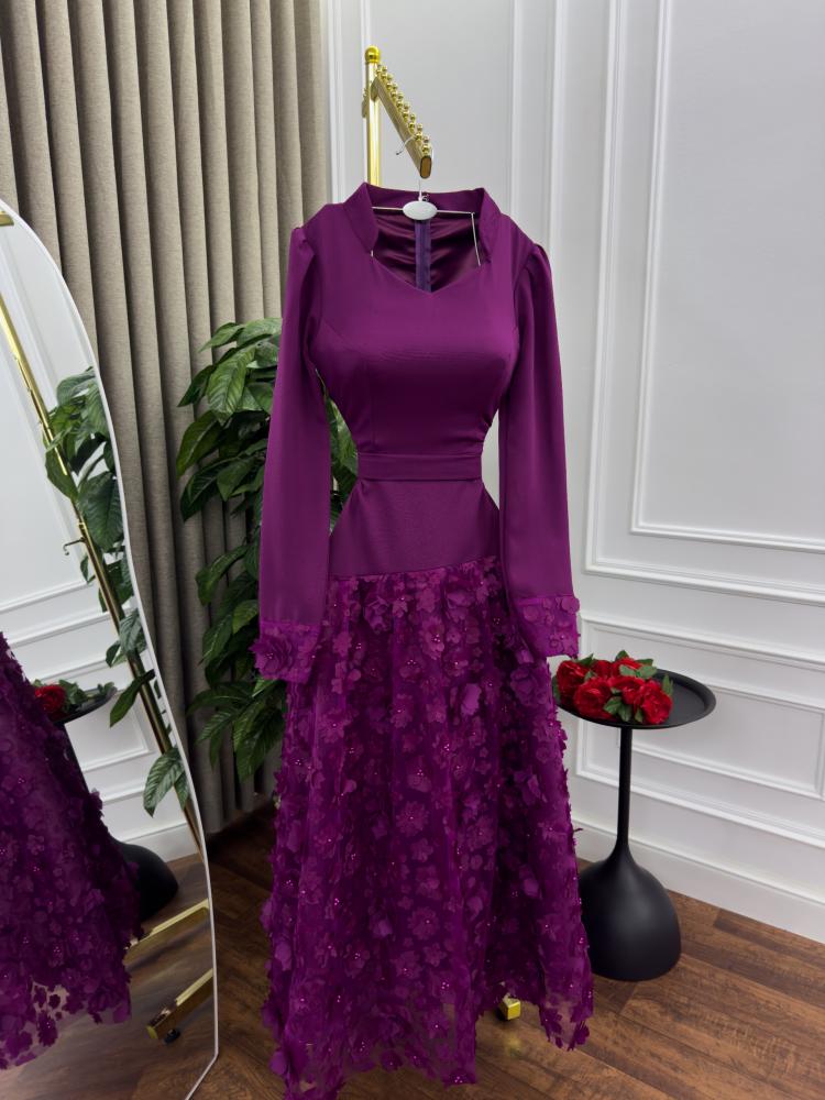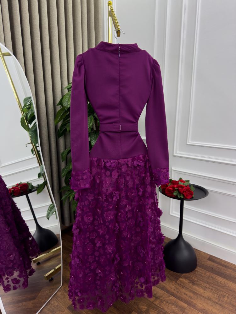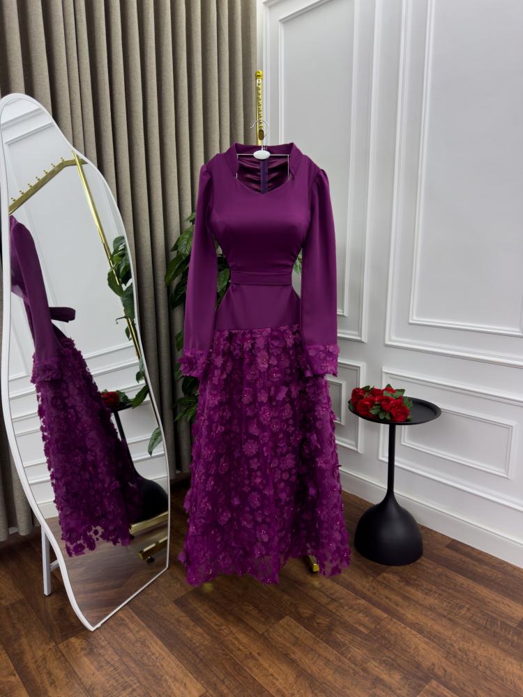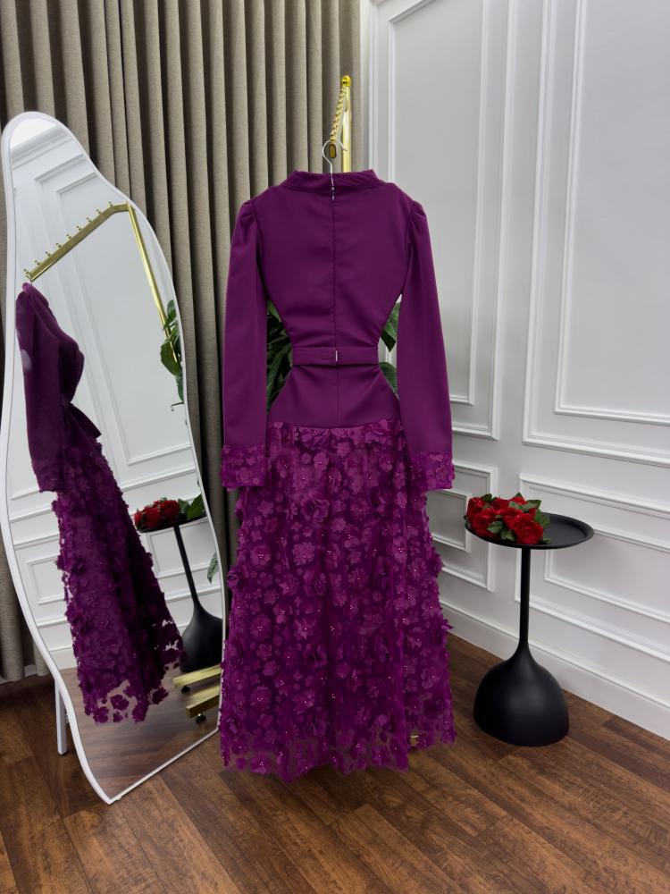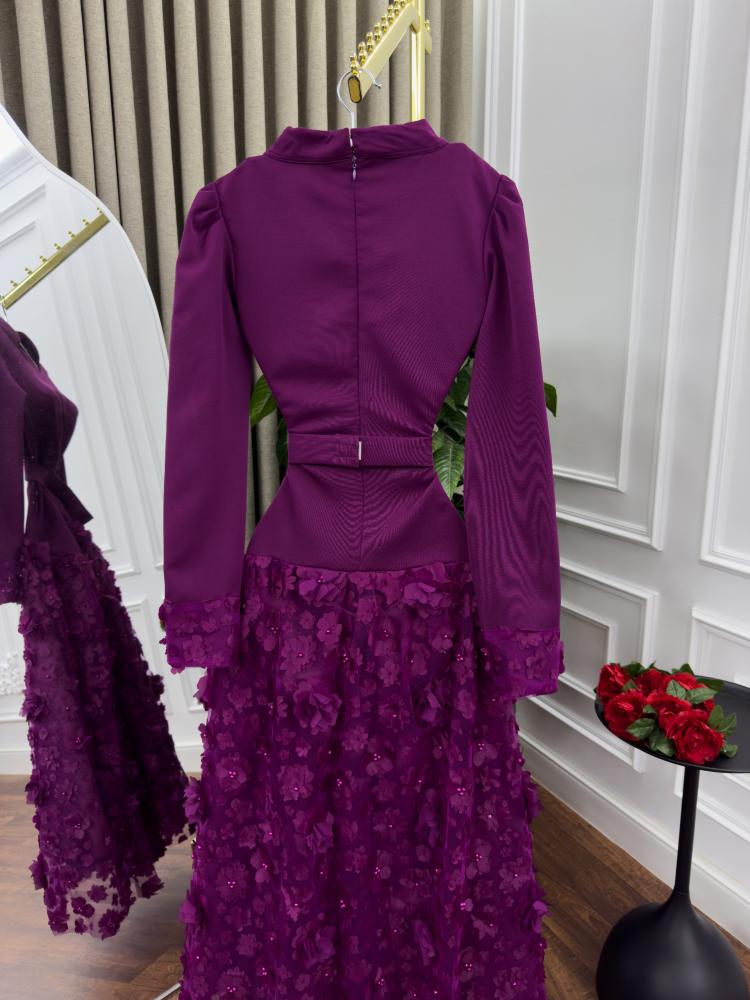 يتميز فستان السهرة بلونه الأنيق من خامة الباربي أكمام طويلة وتطريز ورود بالاضافة الى حزام منفصل يجسد الفخامة بأبهى حلة